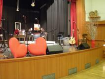 Dvorana v Grobljah je pripravljena za nastop; Lara in Manca usklajujeta vezni tekst; mešalna miza na balkonu. |